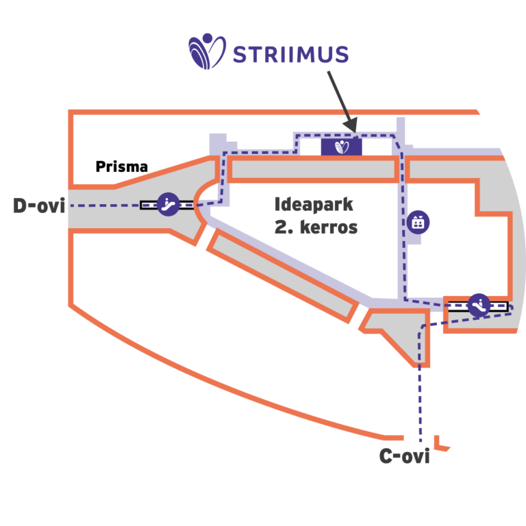 Ideaparkin 2. kerros. Lyhyin reitti on D-oven sisäänkäynniltä, mistä pääsee suoraan liukuportailla 2. kerrokseen ja käytävää pitkin toimistomme ovelle.